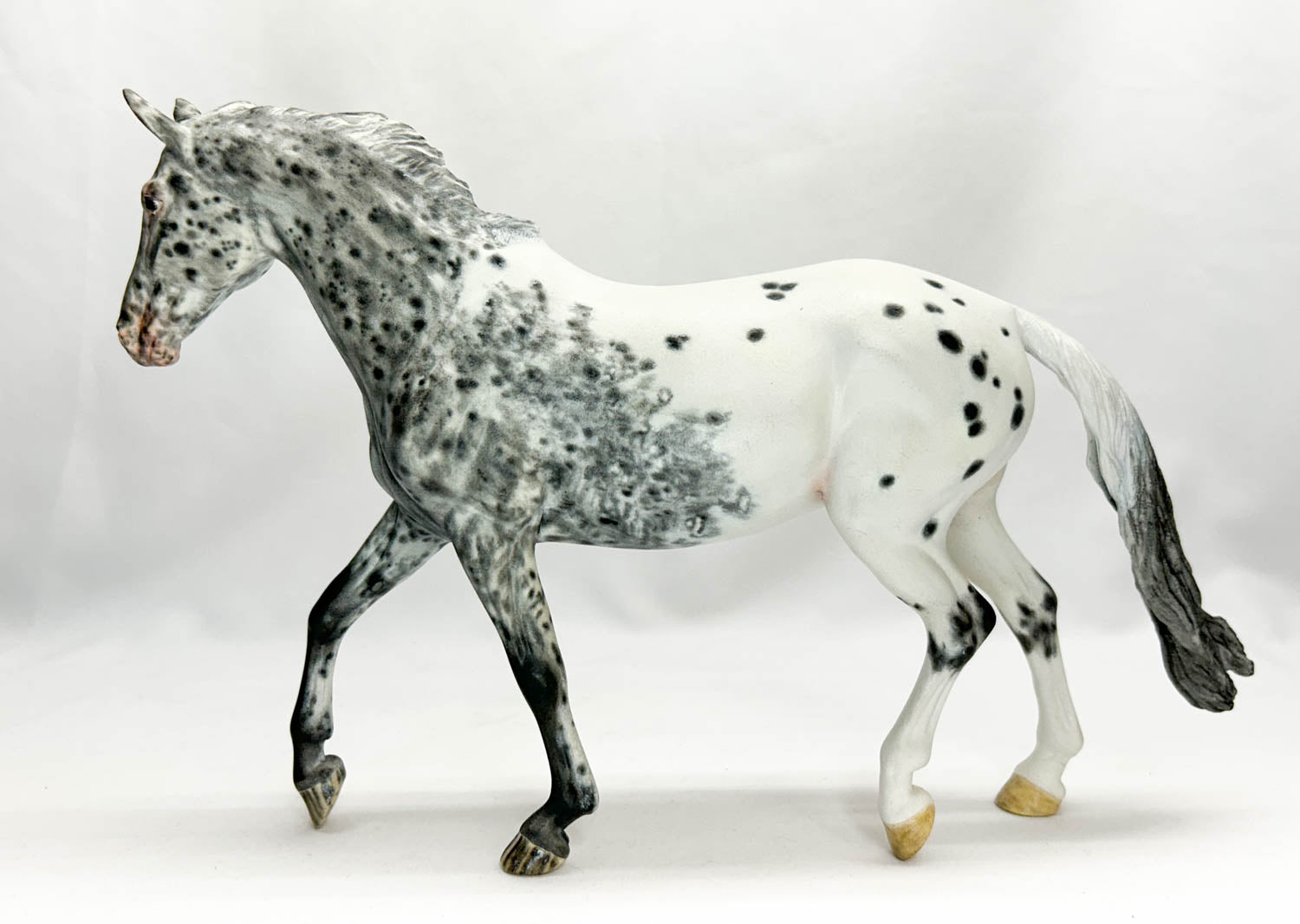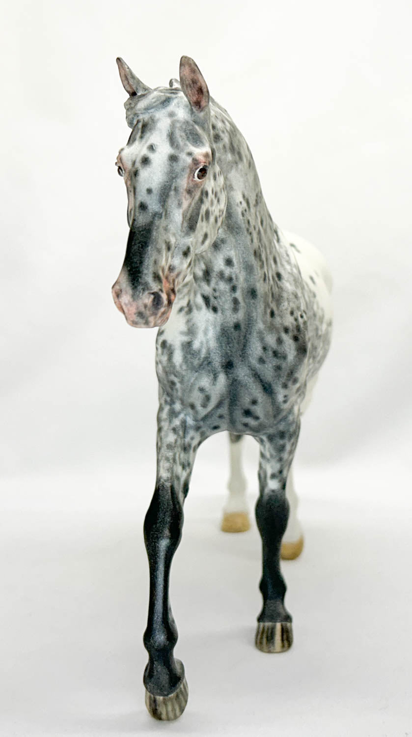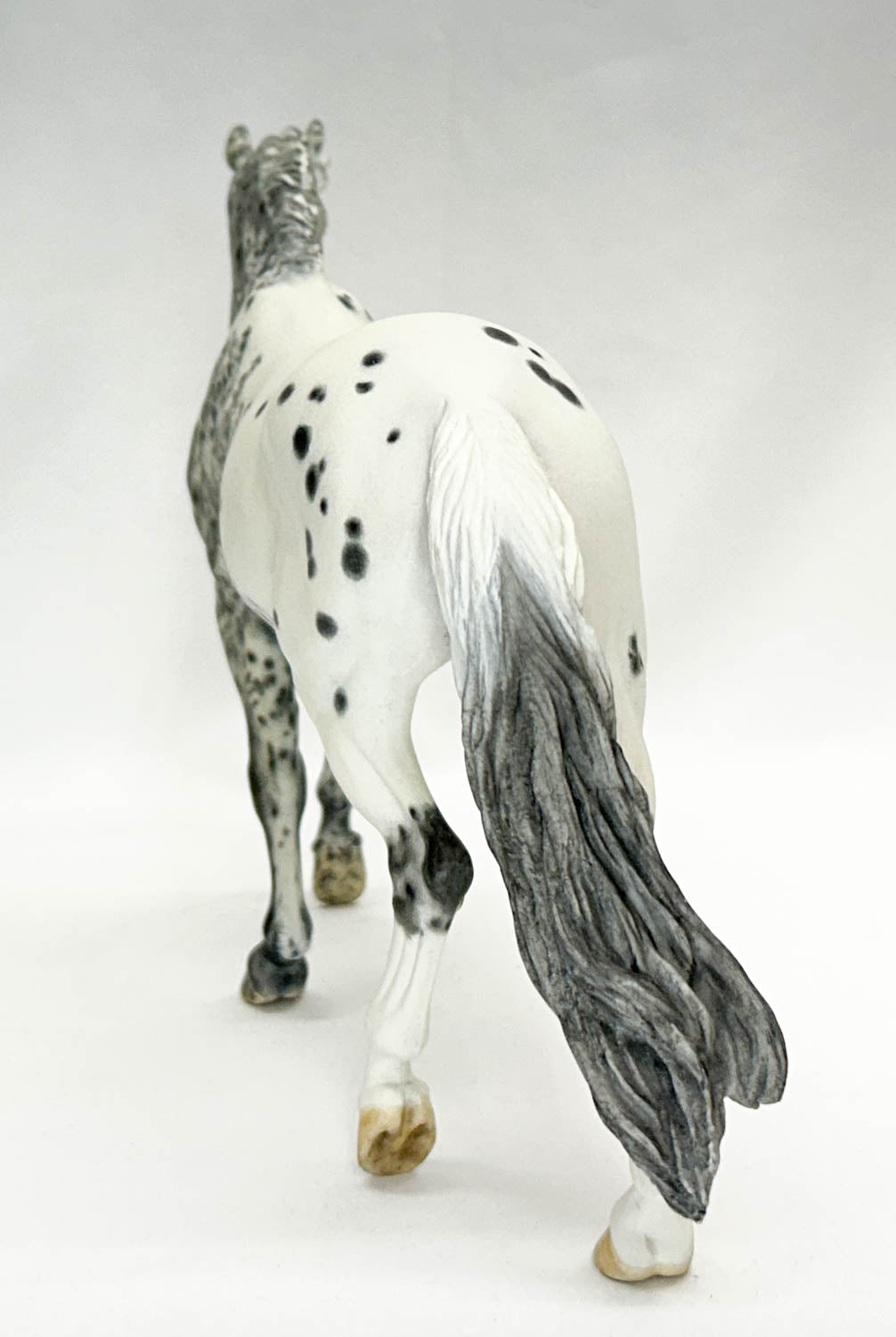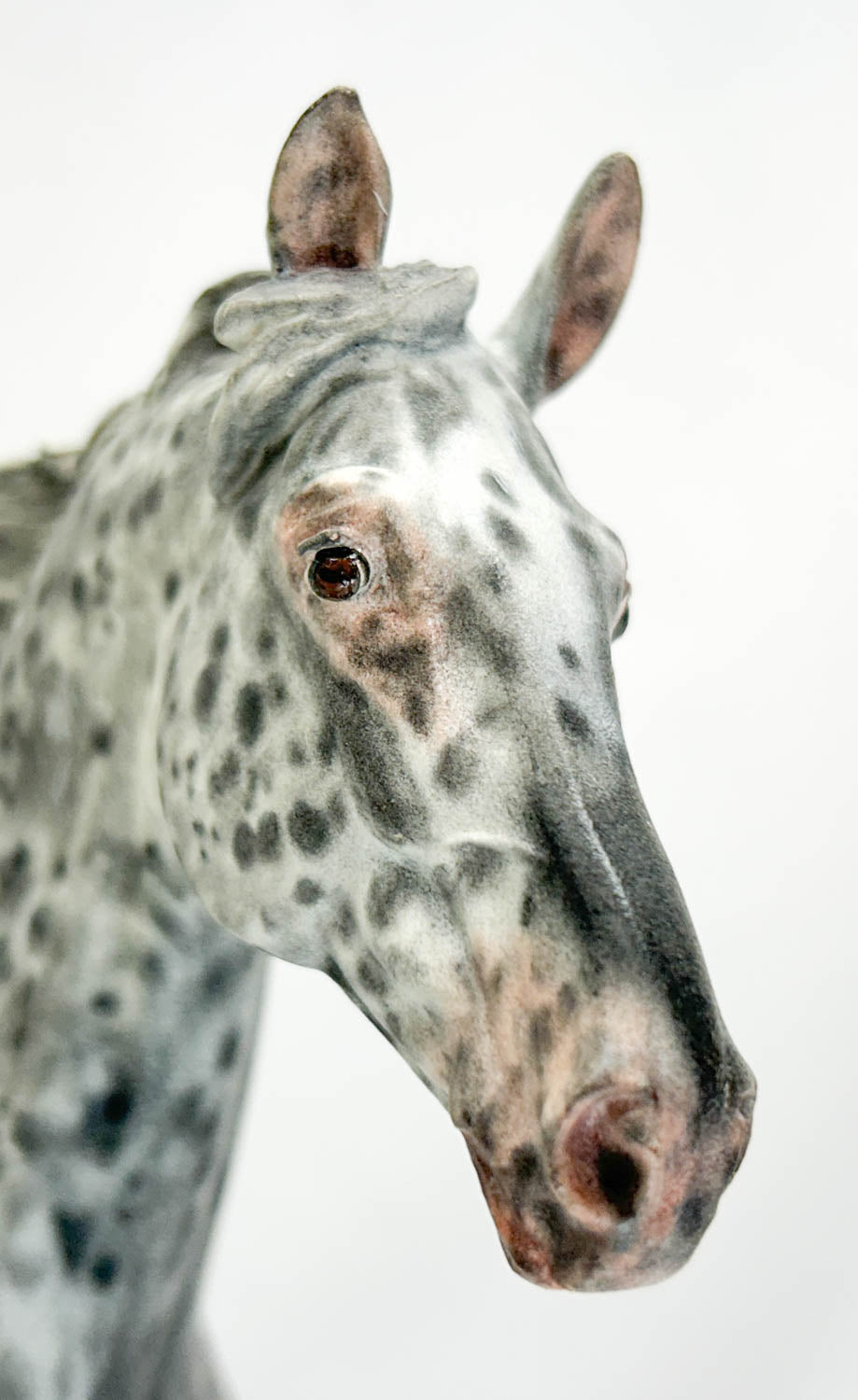 This magnificently done Appy was painted by Eleanor Harvey, signed and dated 2012. She has everything you can want in a spotted mare: Realistically mottled roaning, mapped spots, and pinking on her face that blends beautifully into her coloring.