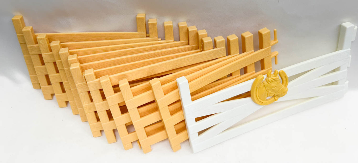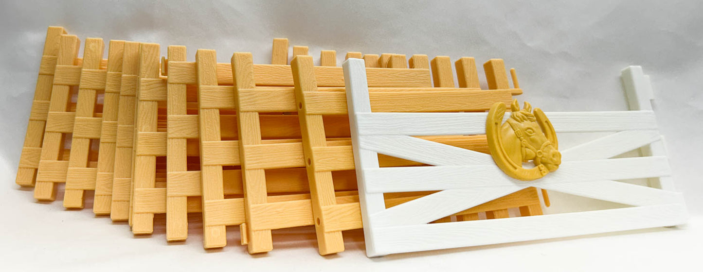 This group includes ten tan fence panels, plus a tan gate hinge panel and a white gate with the gold GC logo.