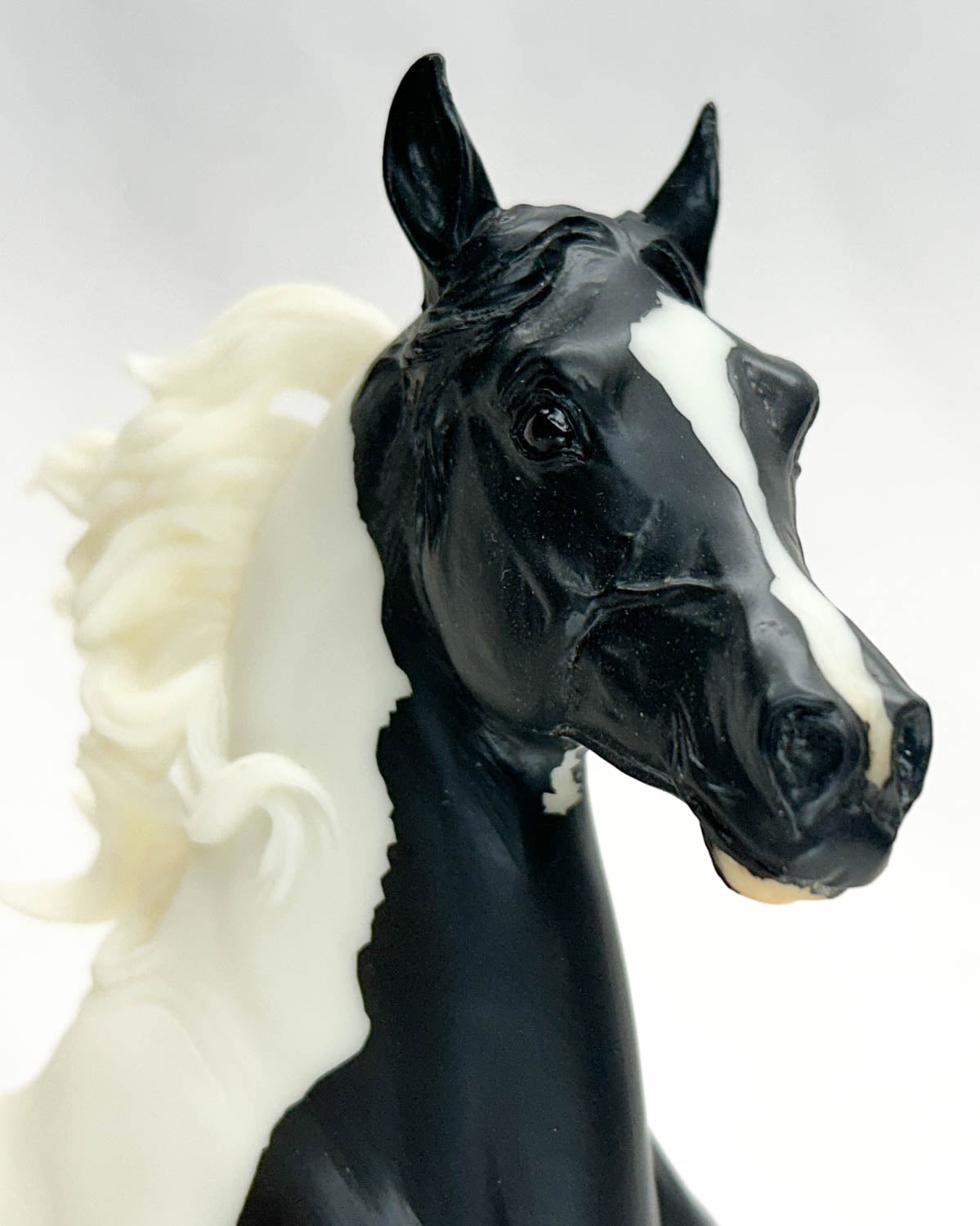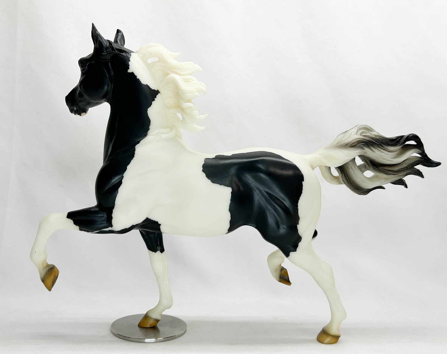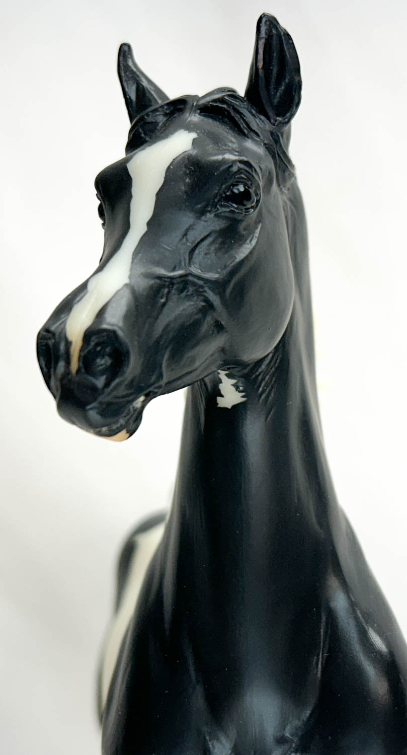 This fellow is Near Mint with a few white specks in his finish as always and possibly slight age yellowing. He features neat masking and really beautifully done hooves. He arrived here without a base, so he's been given one of our solid steel bases, a $22.95 value. His drilled-out peg hole was a little bit loose on the base, so I've wrapped a small bit of Scotch tape around the peg, which has tightened it up, so he stands well.