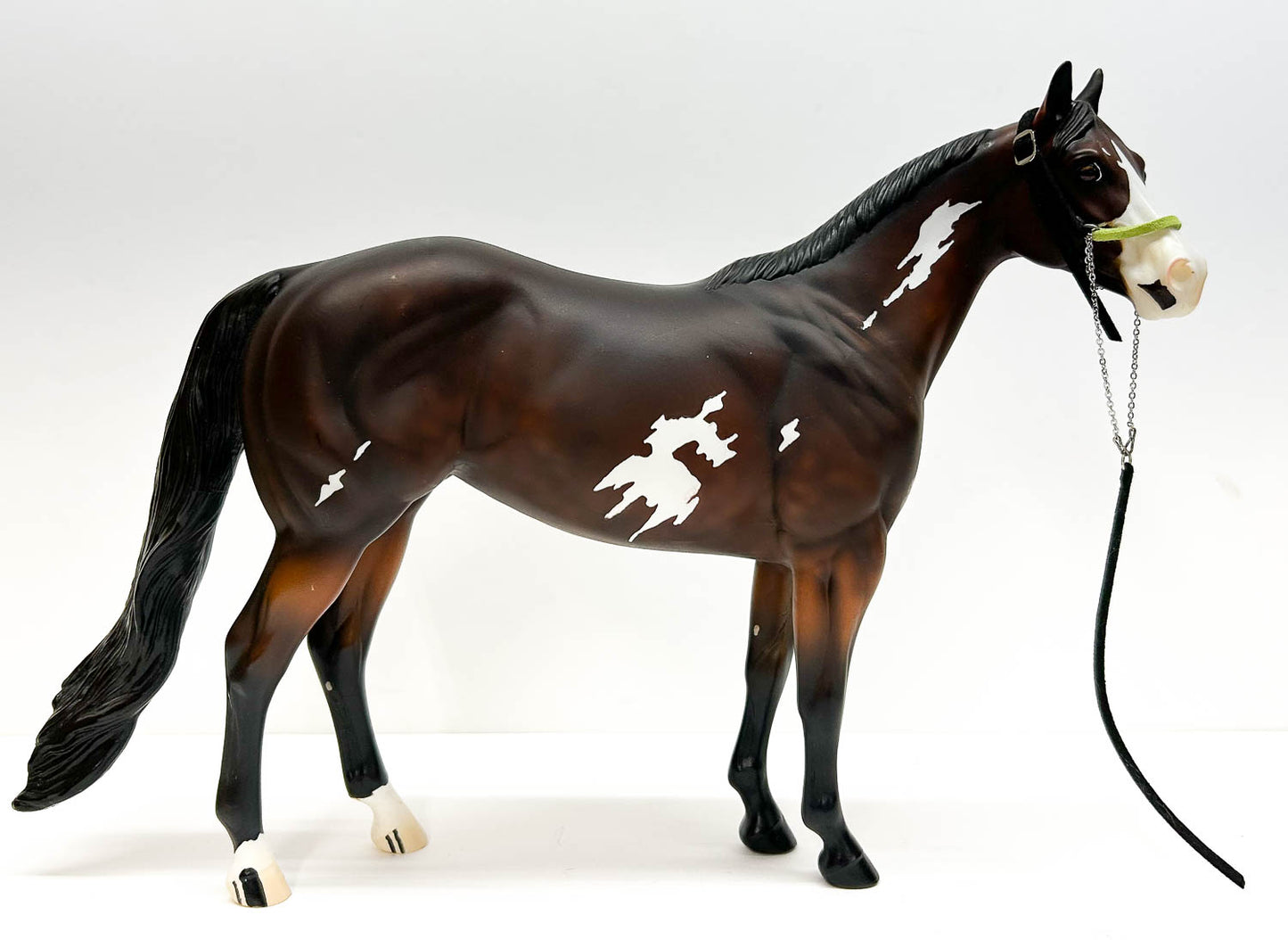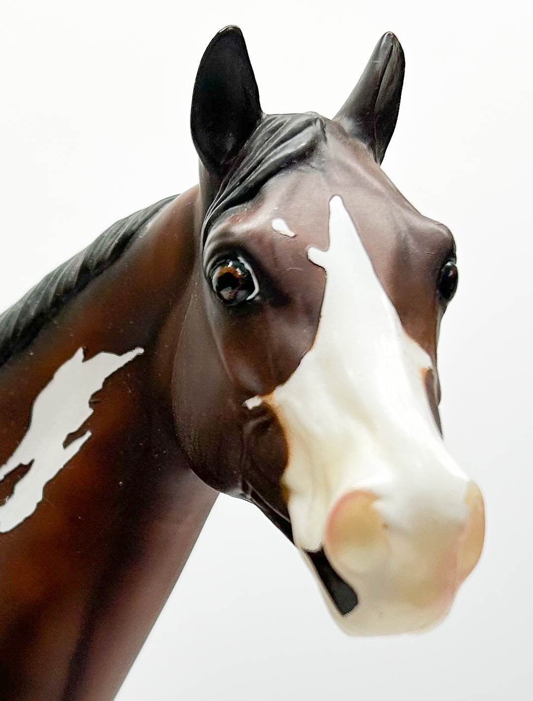 This deep bay pinto on the Stone Ideal Stock Horse mold was an Equestrian Shop SR in 2000. Only 300 were made.