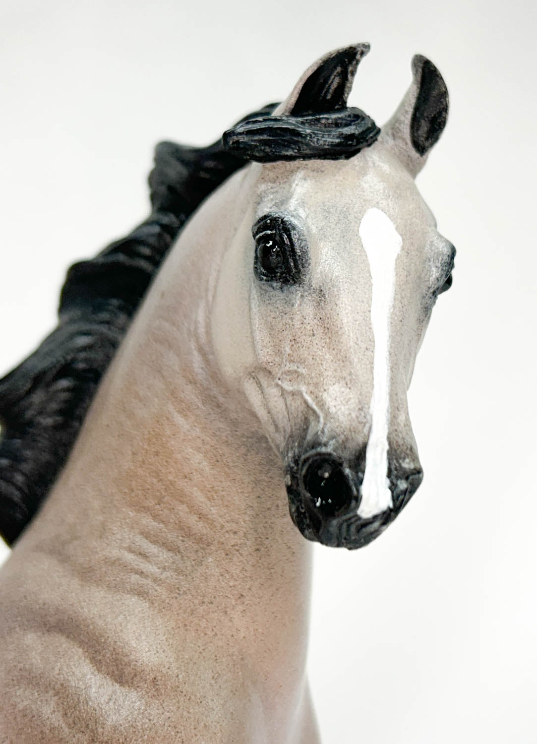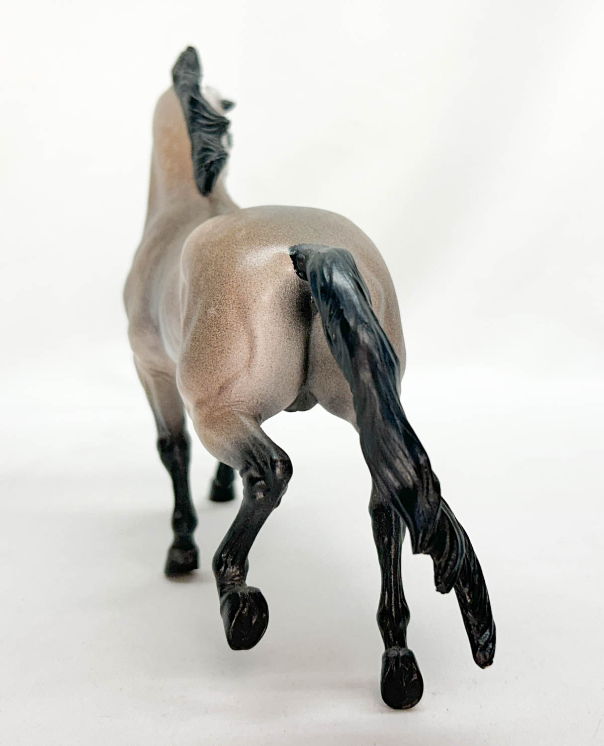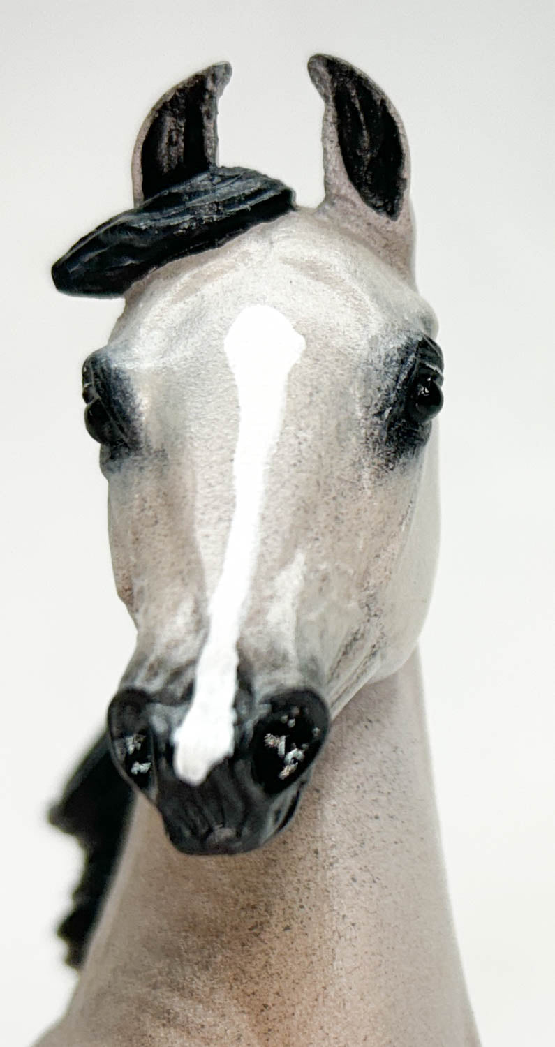This gorgeous boy is the Kulfi Marwari resin by Kristina Lucas Francis. He's got curved eartips and a dynamic cantering pose. I can't read the artist's signature…It appears to be S. Ba… Maybe S. Banita? He is dated 7/91, but his paint job holds up beautifully today. He wears a speckly coat that has dapples just peeking out , dark skin around his eyes, and a little stripe.