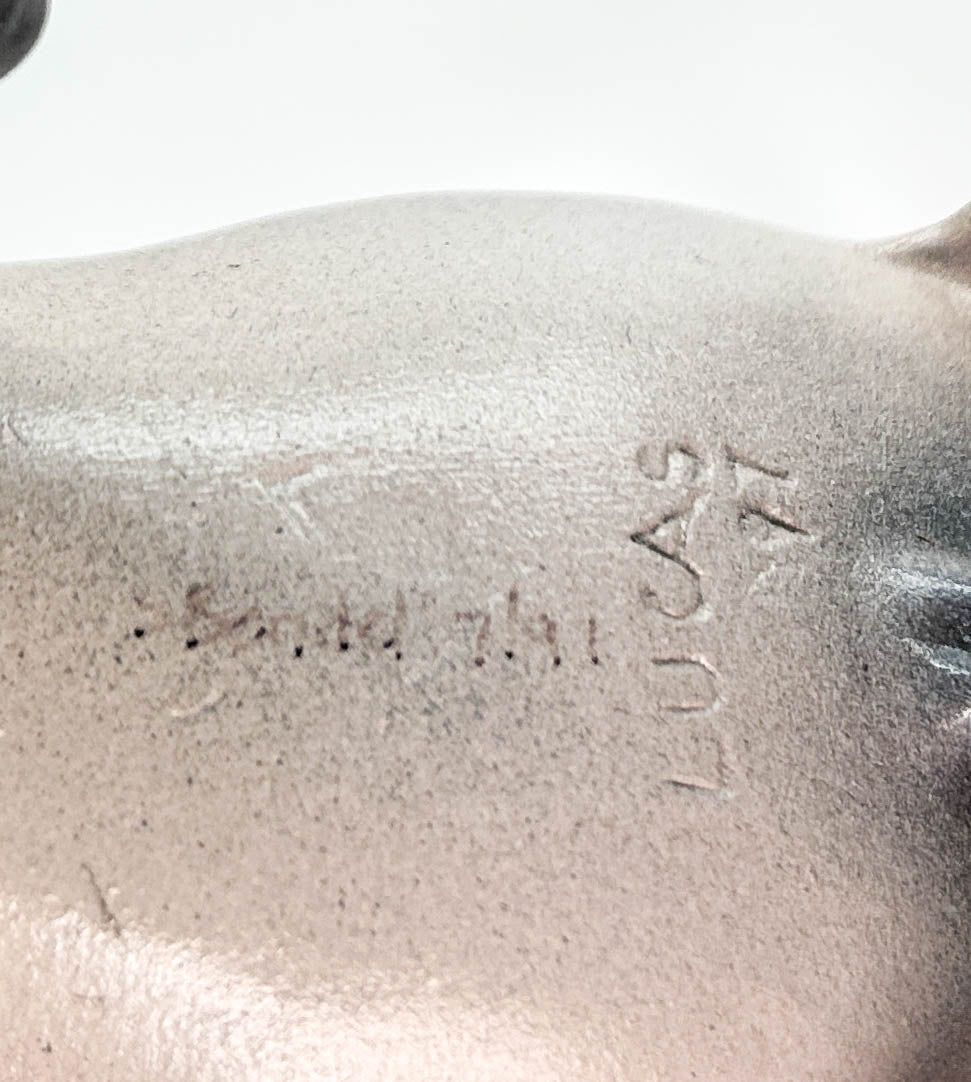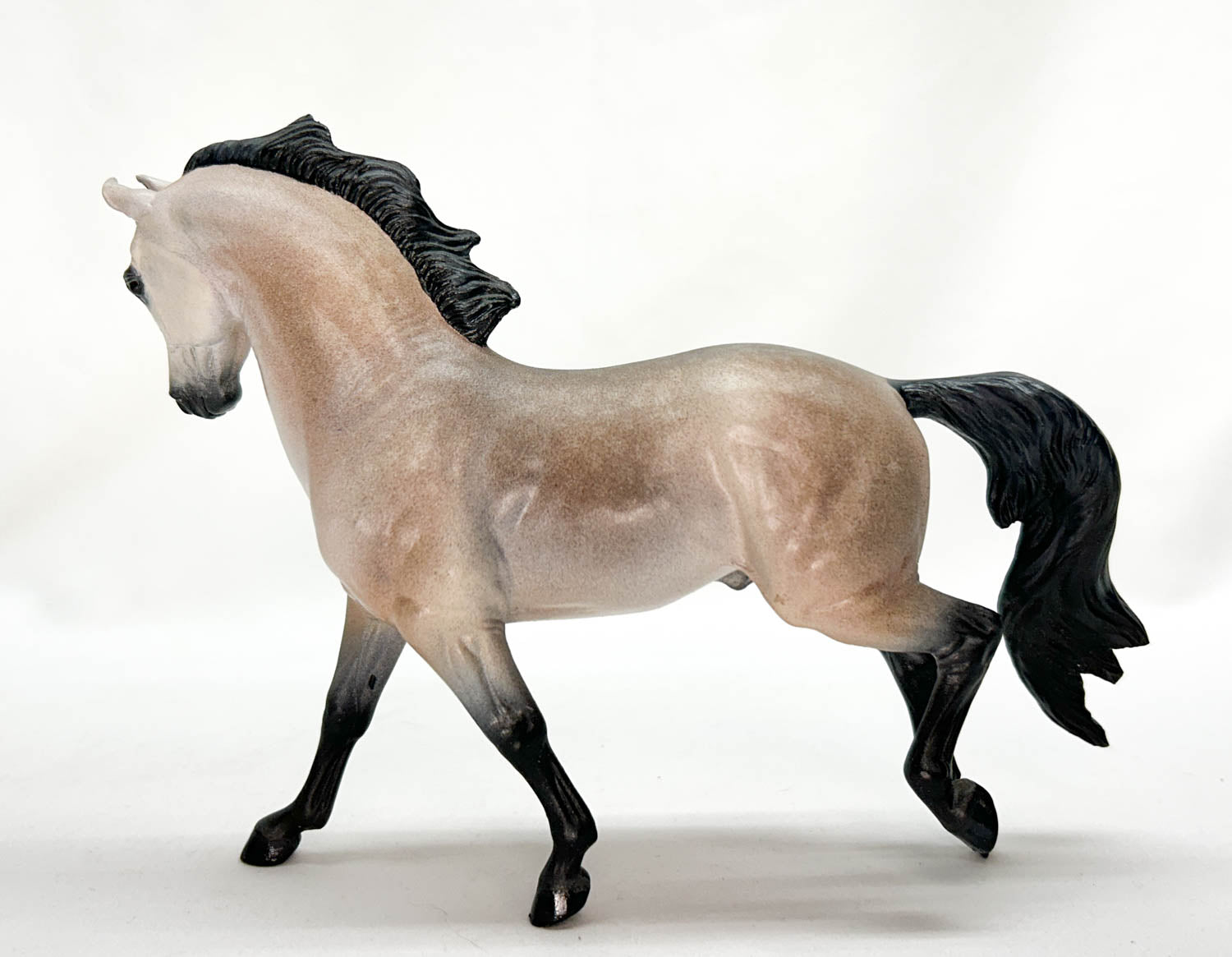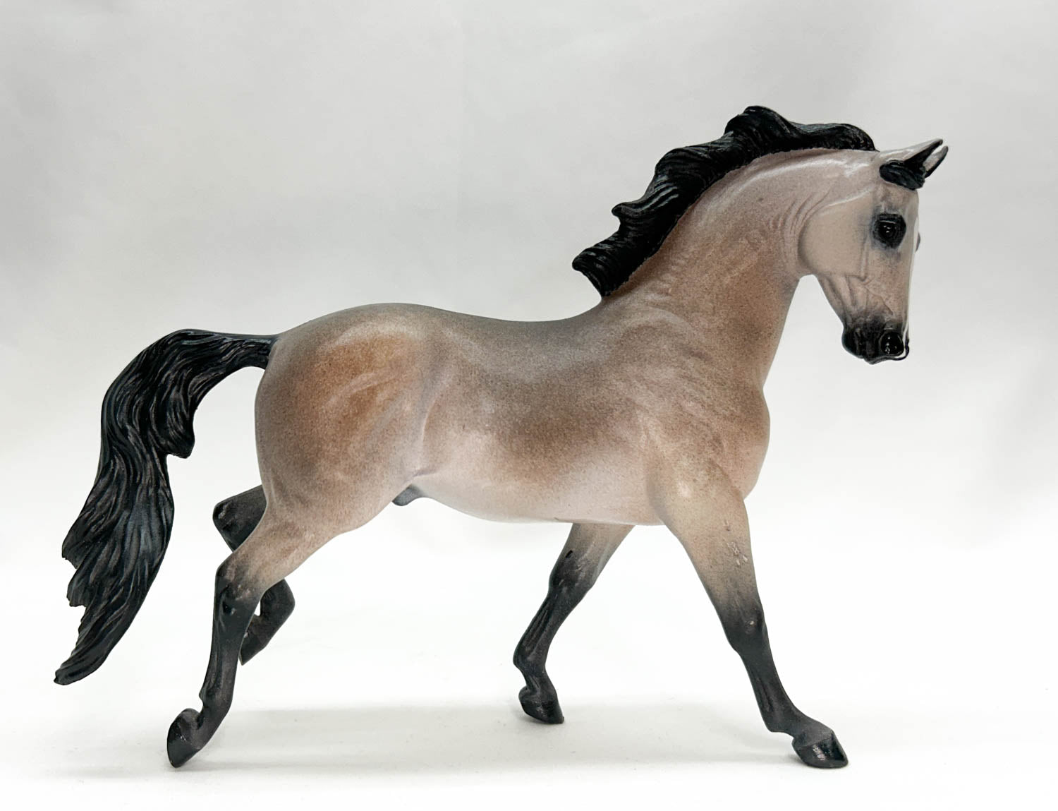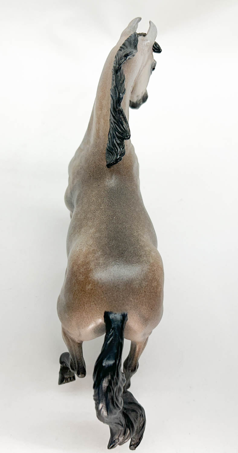 This gorgeous boy is the Kulfi Marwari resin by Kristina Lucas Francis. He's got curved eartips and a dynamic cantering pose. I can't read the artist's signature…It appears to be S. Ba… Maybe S. Banita? He is dated 7/91, but his paint job holds up beautifully today. He wears a speckly coat that has dapples just peeking out , dark skin around his eyes, and a little stripe.