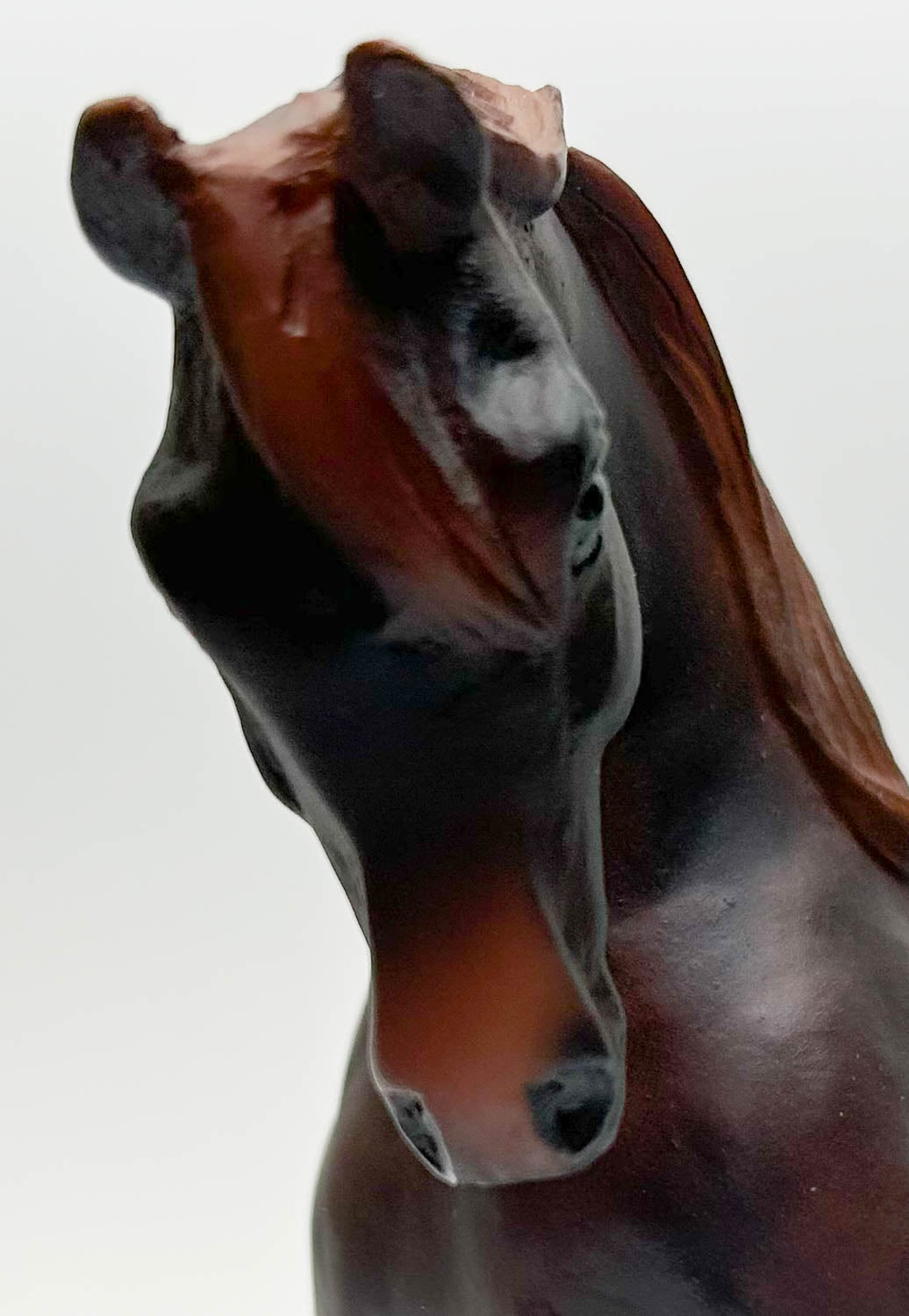 This sweet mare is Near Mint with just a tiny eartip rub and mild age yellowing that you can reverse with a few days of sunbathing. She has a small, rough area in her plastic underneath her belly with a tiny spot that missed getting painted. She features a beautiful, dark chocolate coat color with slightly lighter mane as a pretty accent.