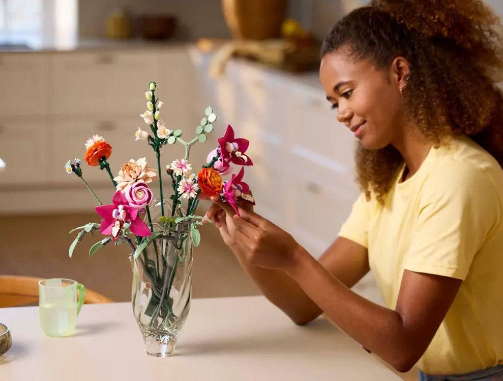 Cultivate creativity with the LEGO® Botanicals Pretty Pink Flower Bouquet (10342) building kit for adults. Bursting with authentic blooms and lovely colors that will never fade, this LEGO flower decor set is a delightful gift for women, men and nature-lovers. Budding florists can relax and unwind as they build the bouquet, which consists of 15 LEGO flower stems, including daisies, cornflowers, eucalyptus, elderflowers, roses, ranunculus, cymbidium orchids, a waterlily dahlia and a campanula. All the stems are adjustable, encouraging builders to arrange a bespoke bouquet that they can use as floral home or office decor. For added customization, the flowers can be arranged with other LEGO bouquets, sold separately.