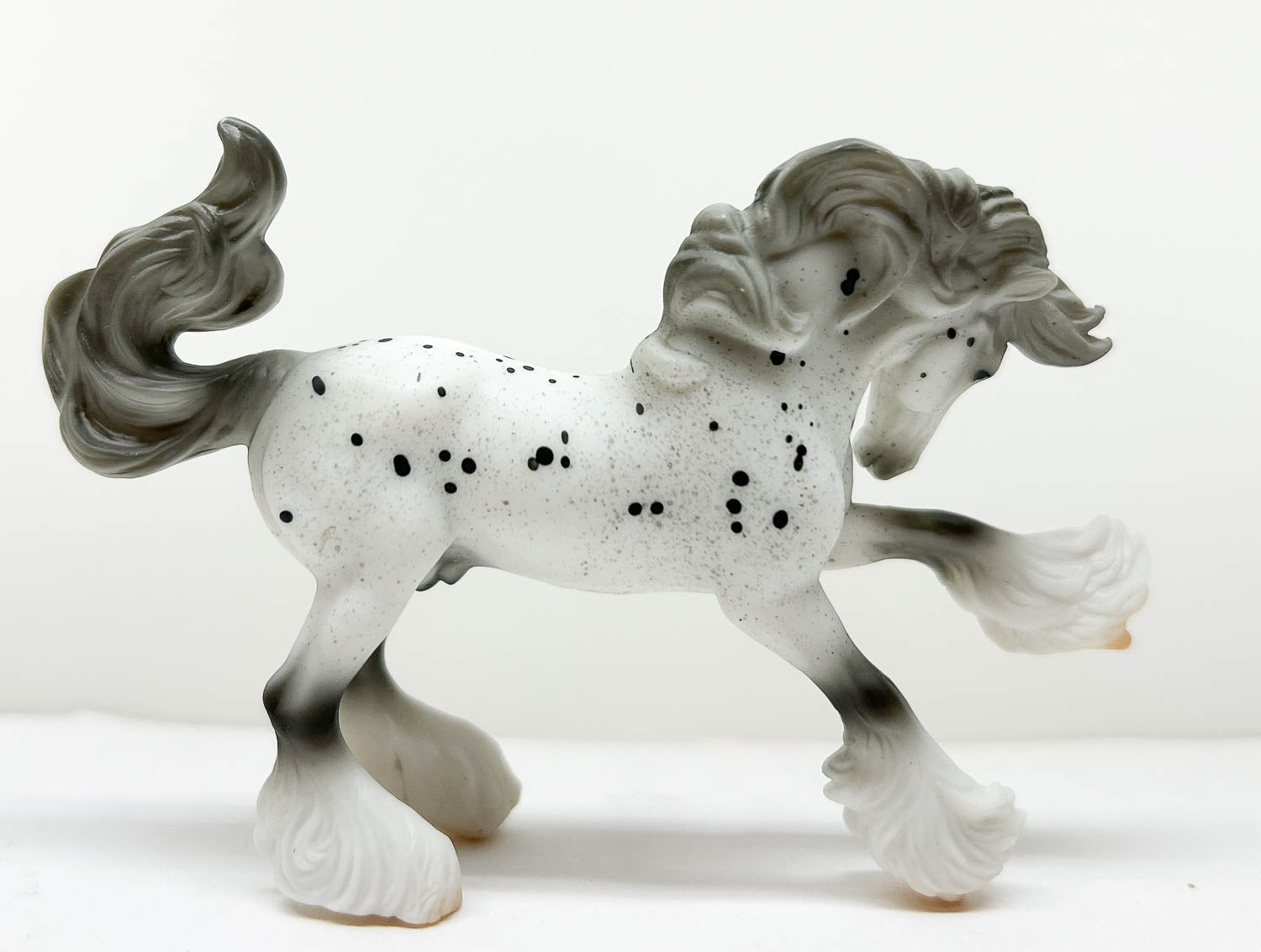 From 2019's Series 2 Mystery Horse Surprise blind bags comes this first regular release on the Mini Vanner. He is a Leopard Appy with black spots, tiny grey roan speckles and a shaded grey mane and tail.