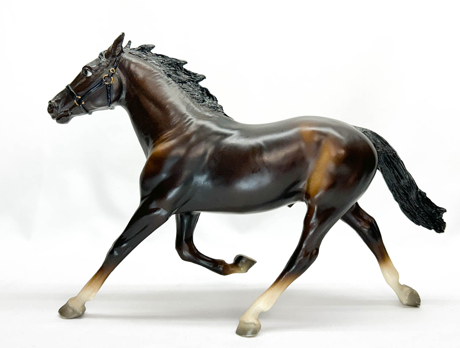 Chris Hess's Standardbred Pacer was originally released in 1967 and continued in bay until 1987.  He wears four socks and a molded-on black halter with metallic gold buckles.  Some of the earlier models, like this one, are actually dark liver chestnut, but were called bay.