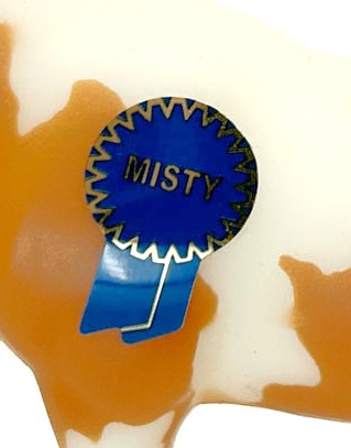 Misty is Factory Mint with a few pinpoint specks in her finish and a very faint yellow spot on her right side that looks like it was a smudge from her body paint that was wiped off at the factory. She features soft muzzle pinking and still wears her original mini blue ribbon sticker.
