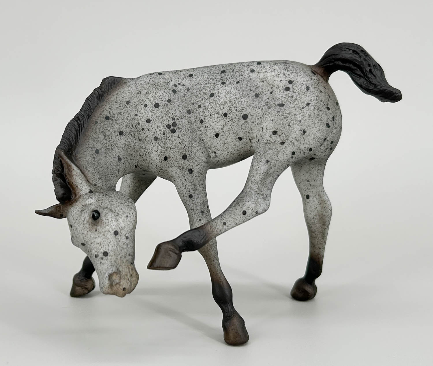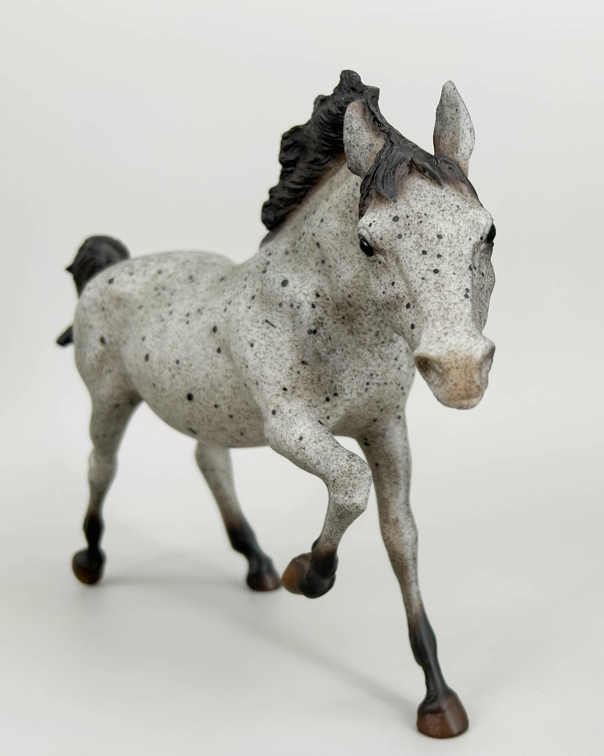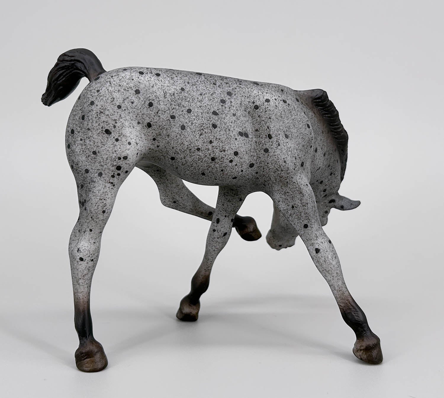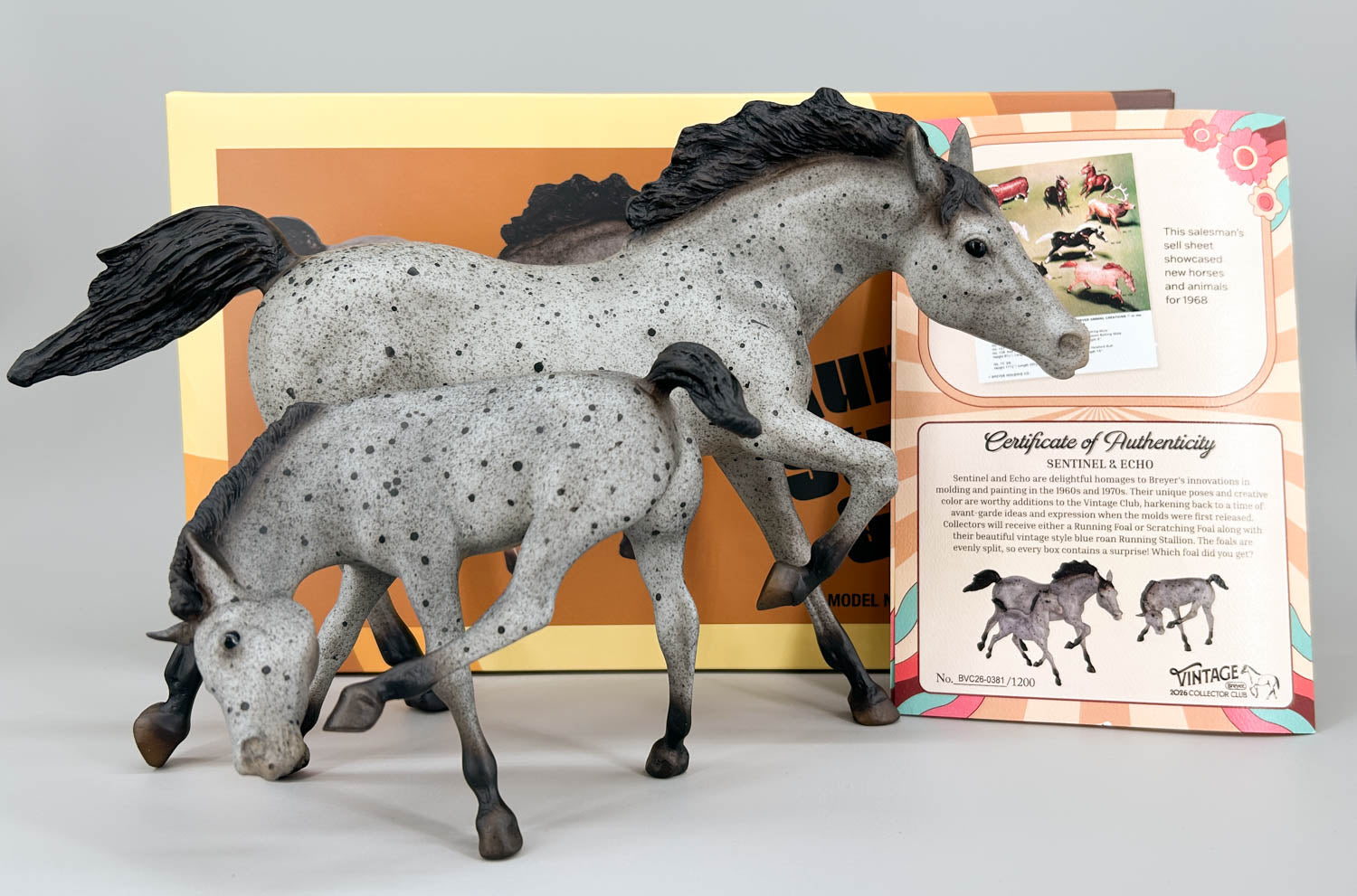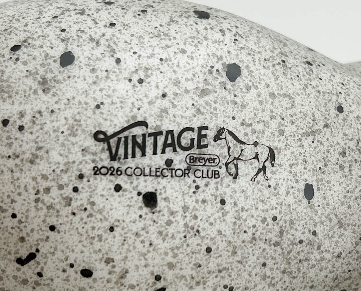This pair delights vintage collectors and collectors of "color" alike! The set included the Running Stallion plus a Gambler's Choice of either the Running Foal or the Scratching Foal. Reminiscent of vintage red roans, these guys instead wear blue roan coats with grey speckling and black roan spotting. Charcoal manes, tails, and lower legs frame them nicely. They were only available to members of the 2026 Vintage Club in February, and only 1200 were made.