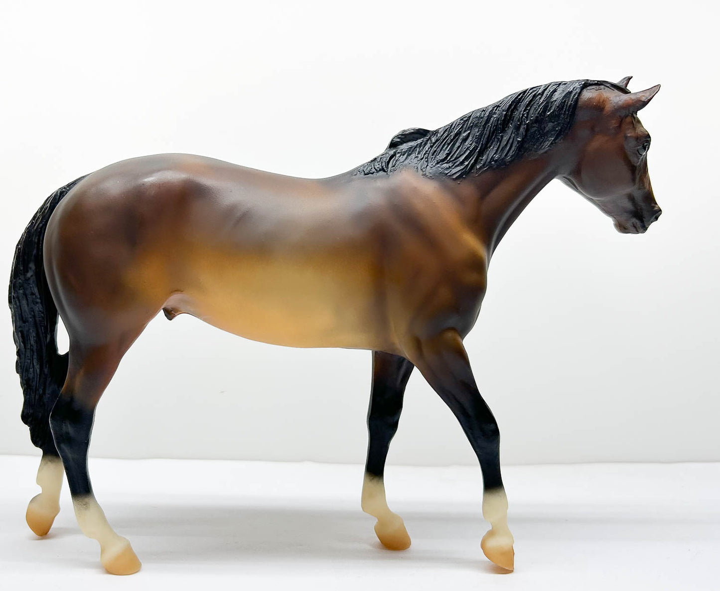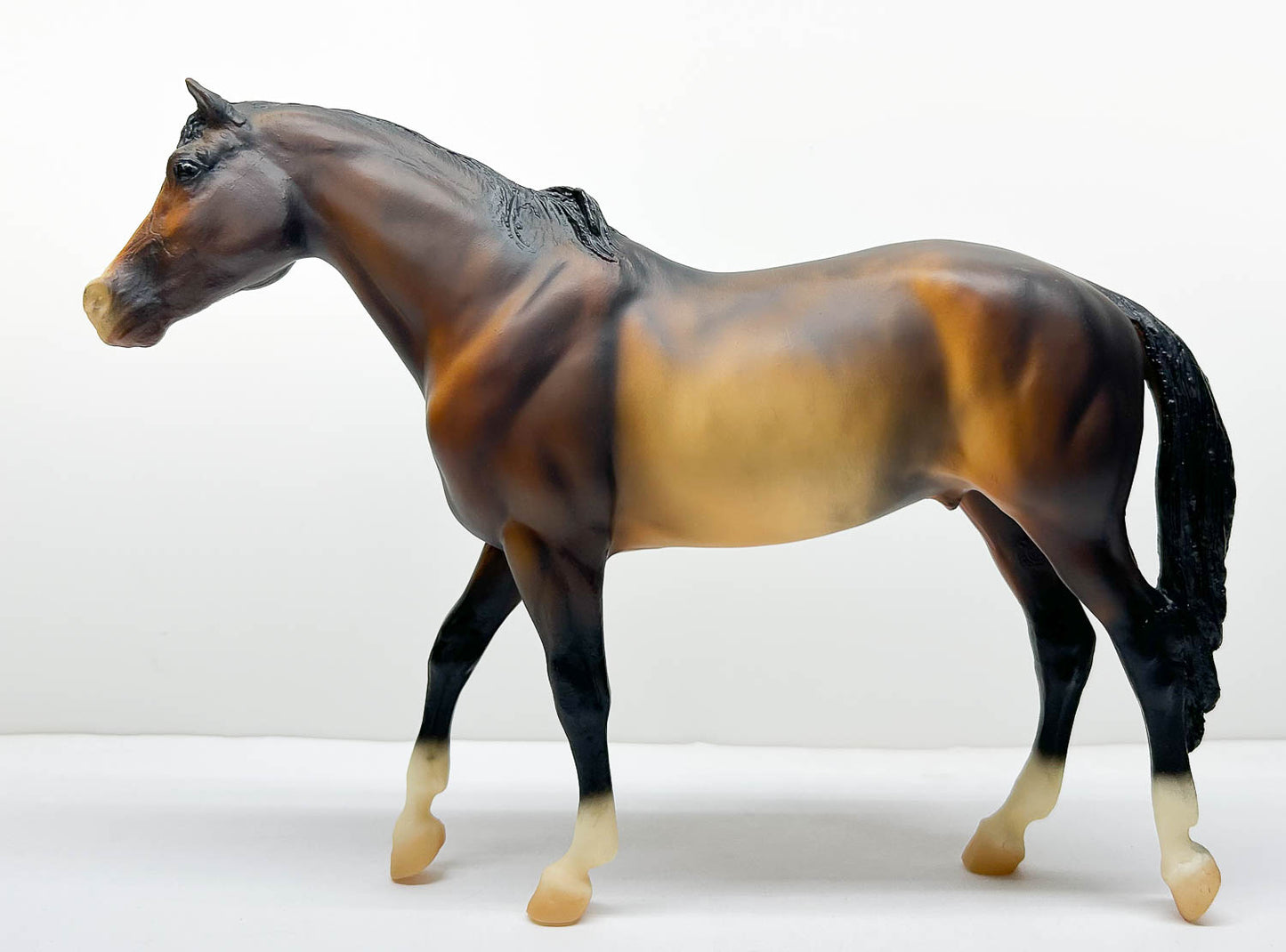 This fellow is Near Mint with a pinpoint light rub (only in the shading) on top of his rump, a couple of tiny grey marks on his left barrel, and mild yellowing, which you can reverse by sunbathing him for a few days/ He has some shading overspray onto his socks and hooves as usual. What a gorgeously shaded fellow! He goes from light chestnut to near charcoal-brown, and just has that "wow factor" that makes everyone pause to admire him.