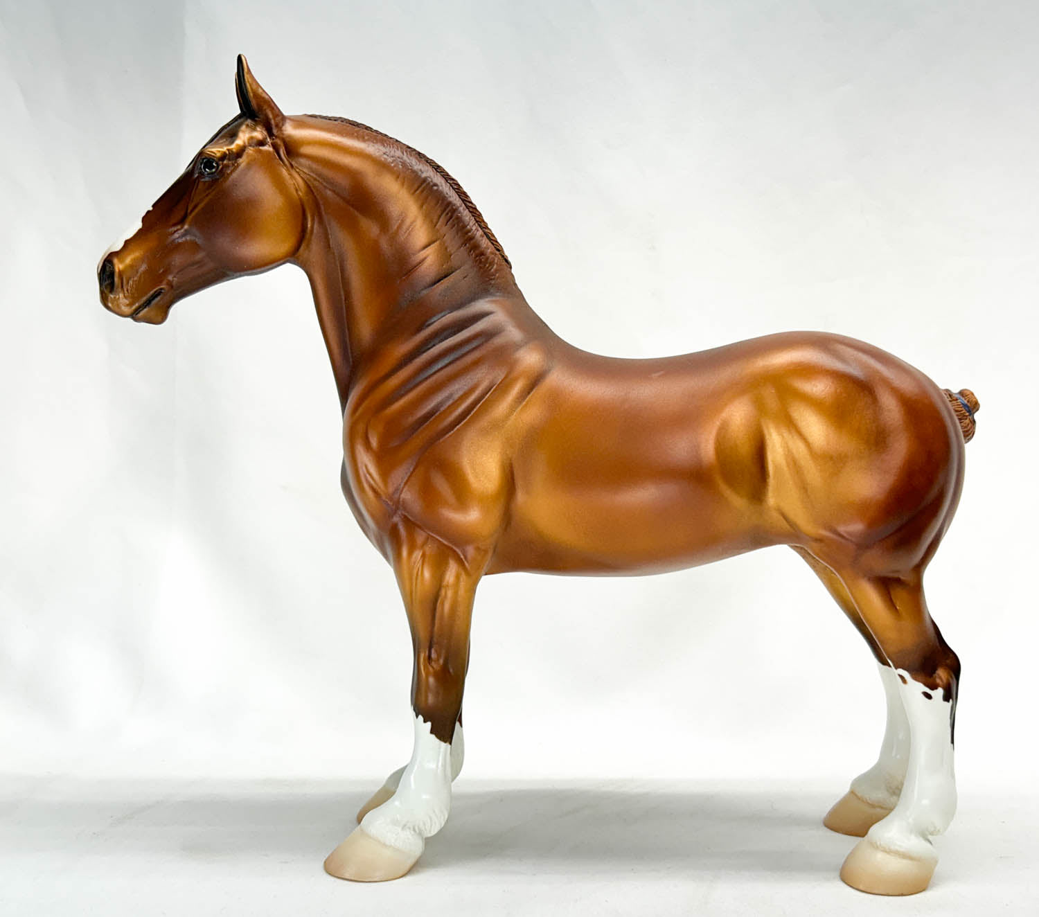 This gorgeous copper chestnut drafter was only available at the Sacramento Summer Model Horse Show in 2008. He sports four stockings and a blaze. Only 50 were made, so don't let him get away - You may never see another!