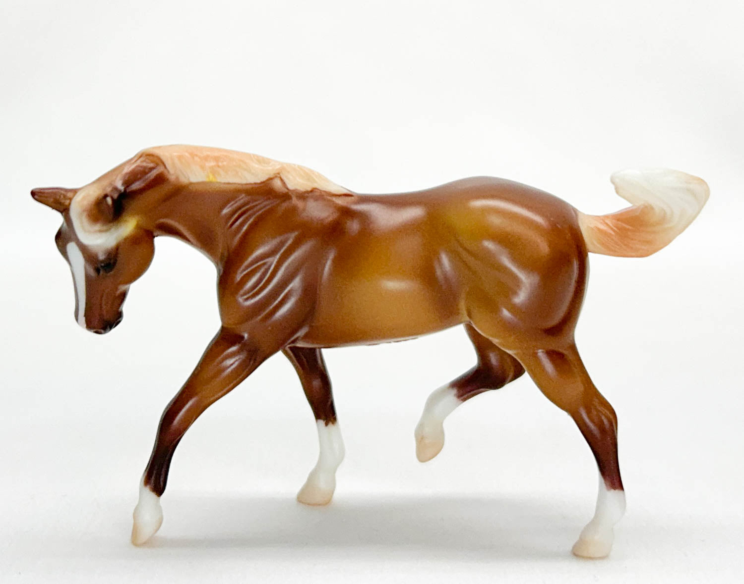 This beautiful flaxen chestnut on the Turning Stock Horse mold is from the Horse Lovers Collection Shadowbox. He wears four socks and a blaze. He was only available from 2010-2014.