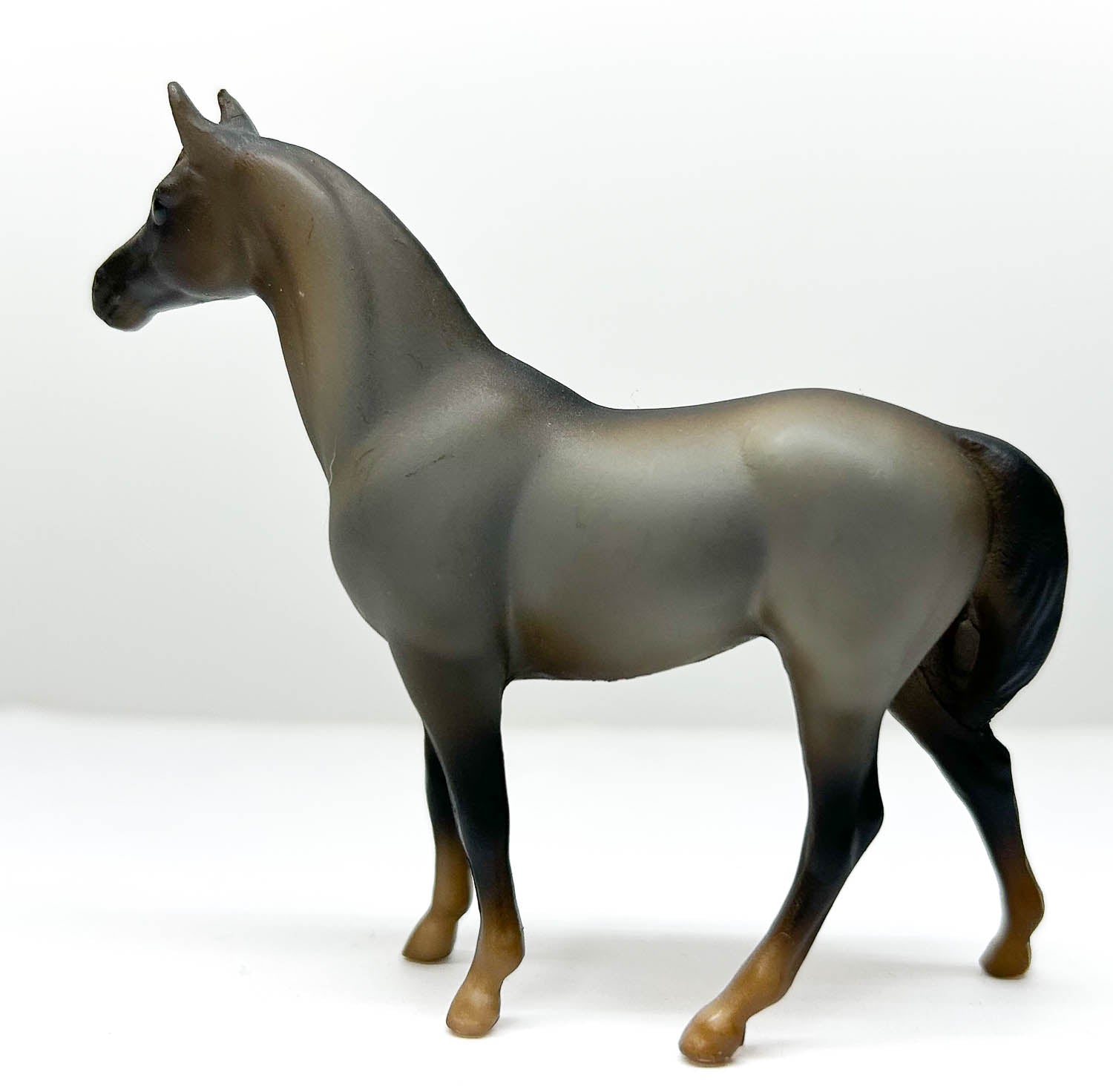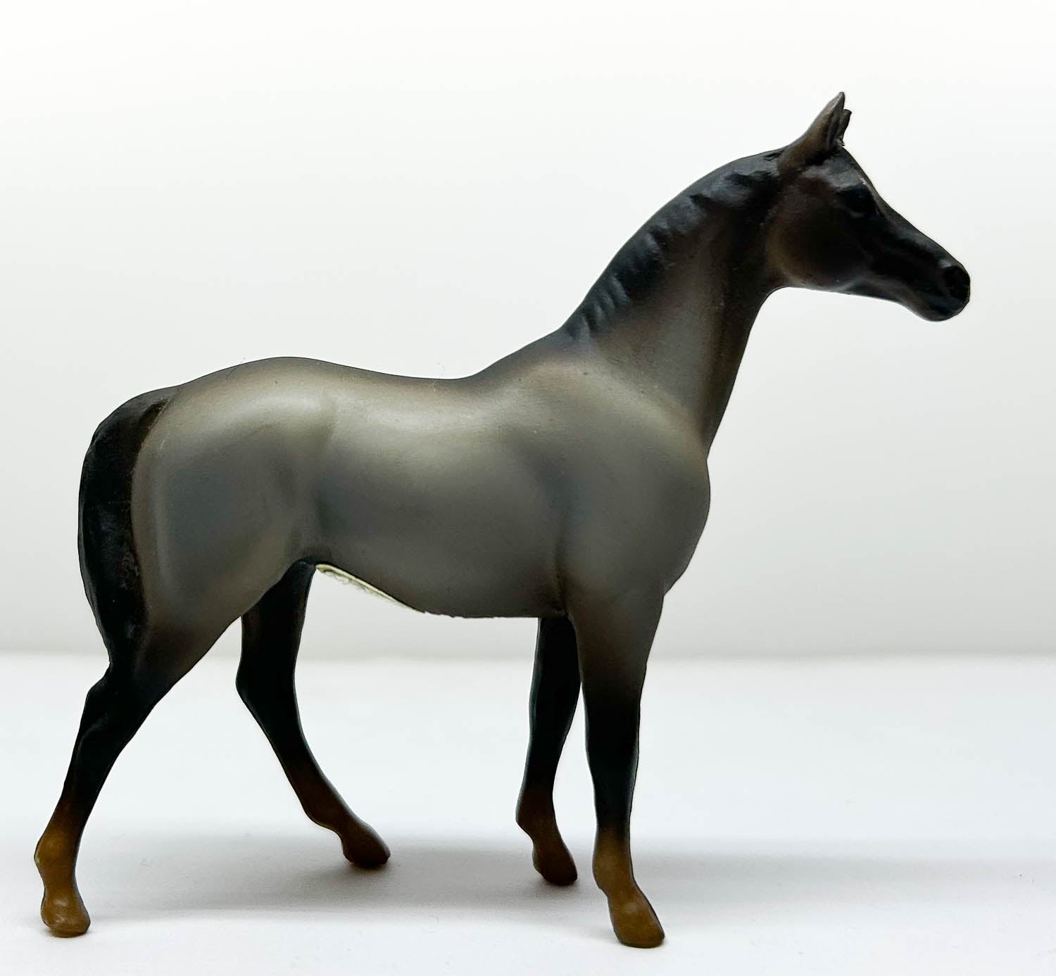 Swaps was only made in this color for the JC Penney Holiday Catalog in 1995.  He wears a grey body with chocolate points, mane, tail, and head, along with a matching dorsal stripe.  He has two hind socks and a solid face, and is very scarce these days, due to everyone loving this cool color.