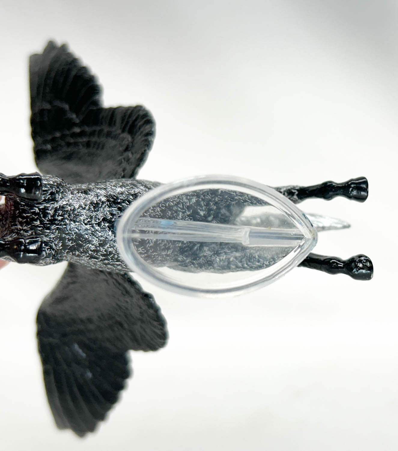 With his wings (on his base) he is now 5.5" H and almost 5.5" wide.  He will be shipped in an inner box that is 9" x 8.25" x 8..25", so postage will be more than for an unwinged Stablemate.