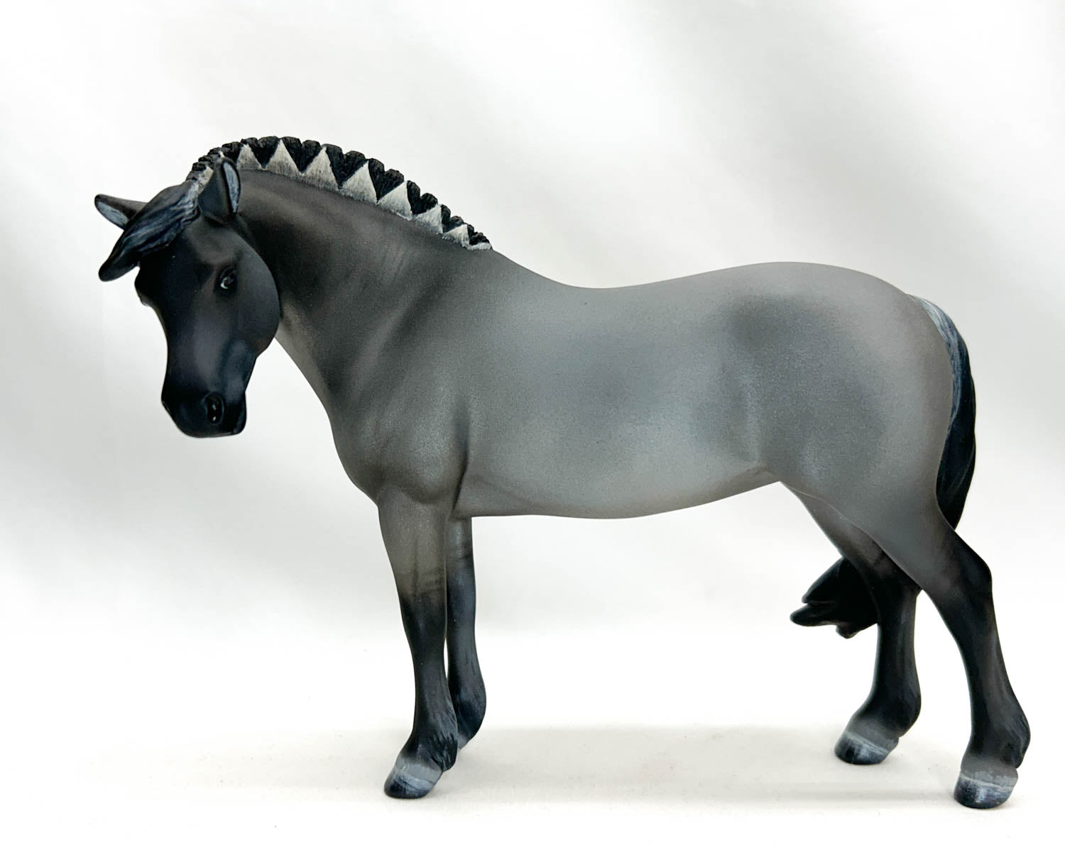 This is a beautiful custom, turning the Welsh Mare into a dark grullo Fjord.  The signature is faded, but she was painted by the amazing Sue Kern (Thompson) in October, 2021.  She features a silvery undercoat that gives her a faint sheen, very realistic without overdoing it.  Her tail has hair-by-hair painting at the dock, and she sports a custom Fjord mane show clip with triangles and hearts.  She's really magnificent and stops people in their tracks when they see her.