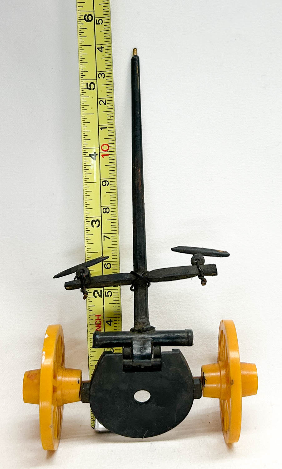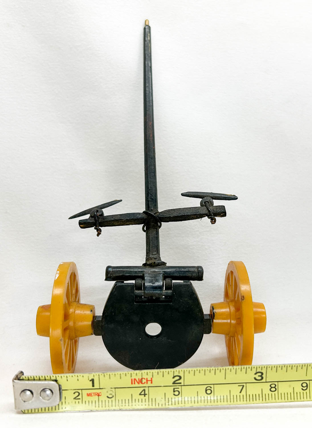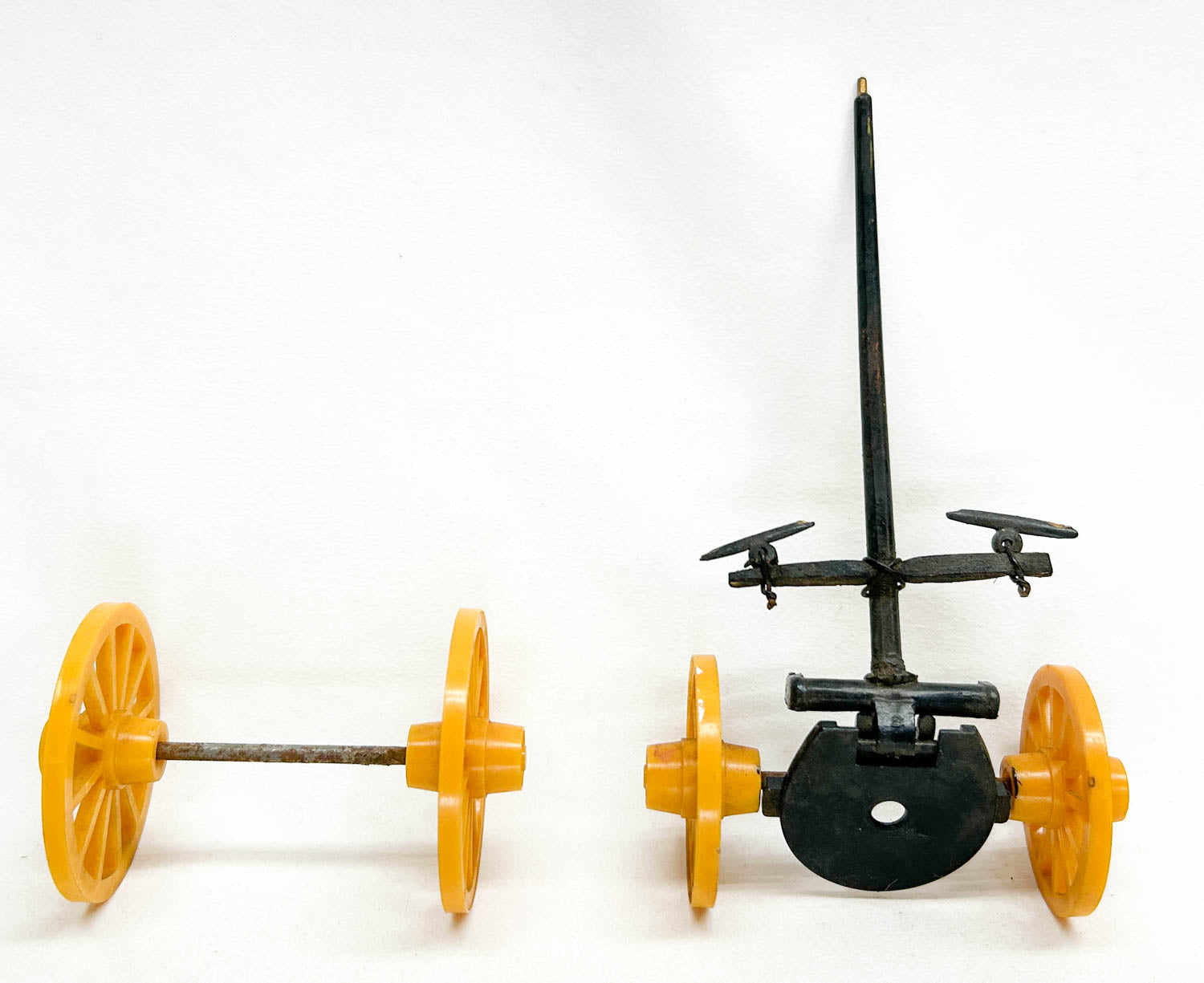 Ready for you to build their carriage: Front axle wheels are 1.5" diameter and have an attached steering plate and pole, which itself has attached eveners! Plate appears to be metal; pole and eveners are wood. Rear wheels are 2" diameter, realistically larger than the front, as they were on many vehicles. Wheels are plastic and can be painted. They are fastened with metal rod axles. These are vintage wheels, but feel solid and ready to go!